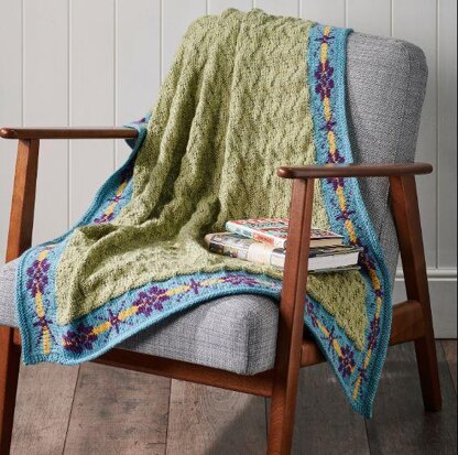 This is a pattern for a Texture and Fairisle Blanket, originally published in The Knitter. It has a simple chevron knit and purl texture pattern with a fairisle border at the edges. Main photos The Knitter.