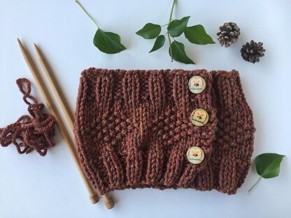 The cowl has ribbed welts at the bottom and top with a moss stitch/seed stitch diamond pattern encircling the body and is fastened with three large buttons. It is knitted flat on two needles. The cowls pictured are worked using a lovely soft wool acrylic mix yarn in super chunky weight.