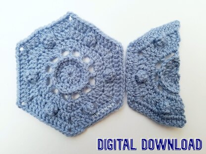 The block is worked in the round and from the front, using a range of stitches. The pattern is for the full hexagon and matching half hexagon motifs. Included in the PDF are step-by-step photos and detailed written instructions.