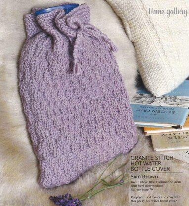 This is a pattern for a Textured Hot Water bottle Cover, originally published in Knitting magazine in one of the issues following Aug 2016. It has a granite stitch all over, with garter stitch top and eyelets and a tie to fasten. Photo Laurel Guilfoyle for Knitting magazine.