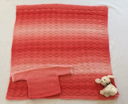 A unique pattern stitch that is so easy to remember, you will love having fun knitting up this great gift set! Done in the new "ombre" colored yarns, you can make a generous size blanket and enough yarn left to make a matching baby sweater! Finished blanket is 36 1/2 by 37 inches, sweater in 2 sizes up to 6 months.