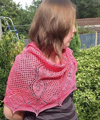 A textured stitch pattern, lace panels and unusual construction form this semi circular shawl which hangs comfortably over your shoulders. Knitted from the nape of the neck outwards in one piece with easy resizing options included. Full Charted and Full Written instructions included.