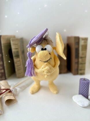 The toy is made from the wireframe, which will help to fix any desired position. He can bend his legs, arms, and fingers. He is very obedient and will gladly hold any light objects in his hands. The alien is a crocheted toy. There is a big square cap with a tassel on his head... He loves science, books, and make new friends. The big ear is a symbol of learning. You can give it to any schoolchild or student, as well as a teacher, as a gift. The crochet pattern consists of 28 pages and includes more than 70 photographs and charts. The height of the toy using the stated materials is about 24 cm/9.4 inches.