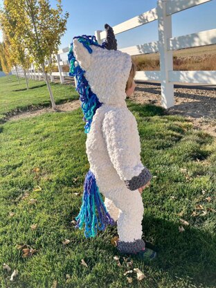 Using Super Bulky weight yarn, The Crochet Unicorn costume is constructed in pieces and seamed together. hooves, mane and tail are added after seaming!