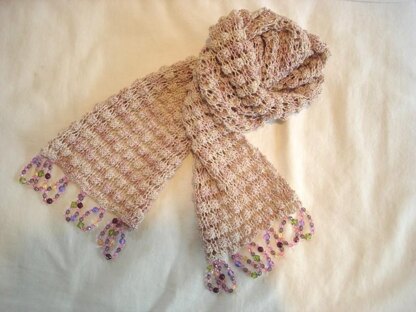 This scarf is knit in an addictive and fun stitch pattern on a #8 needle. It looks great over a tank or sweater and even with a jacket. An airy and light rayon yarn was used in pattern but any yarn that knits at about 5sts per inch will work. The beaded fringe is simple and clear in pattern and no previous beading knowledge is necessary. Or, you can skip the beads. Finished measurements are 10"x 60".