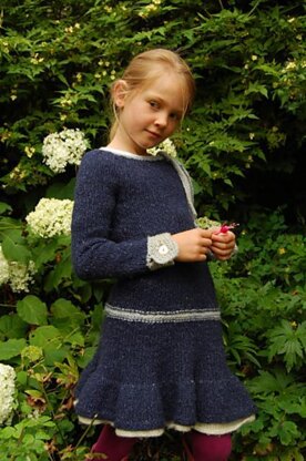 The blue sample is knit in a wool yarn with a very small admixture of silk, but any wool or acrylic yarn is fine here. The underskirt is knit in fingering weight yarn.