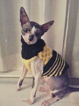 This irresistible pattern was designed for my slim hairless kitty. He's got a 7" neck and 14" body circumference. An easy knit that can be done overnight while you're watching a good show! You're pet will thank you for this stylish wardrobe item.
