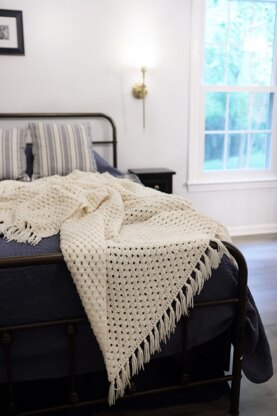 "Simple crochet stitches, clean lines, and lovely tassels -- The Brookhaven Throw is the perfect classic blanket to add a touch of warmth and cozy to any space. The easy rhythmic stitches make it a relaxing project for novice and seasoned crocheters alike. The extra-squishy stitches result in a lofty blanket, making it a perfect weighted blanket at almost 4.5lbs."