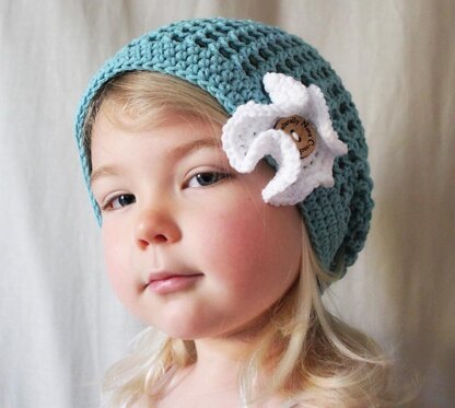 The Cameron Cap is a slightly slouchy mesh hat designed to sit off the forehead. It features a super easy, adorable ruffly flower. This hat was made with spring and summer in mind. It is super breathable and light, perfect for when the temperatures cool down in the evening for a stroll along the boardwalk :).