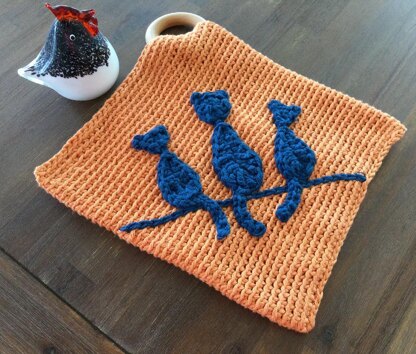 This potholder is worked in the round and uses simple stitches. The cats are made individually as applique and sewn on. A small amount of surface slip stitch is required.