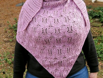 This lightweight triangular shawl incorporates two distinct Japanese lace stitches. It is knit from the top down, and the stitches cause a pretty and delicate scallop at the neckline. While the shawl looks difficult to knit, it is not hard, and is suitable for intermediate knitters.