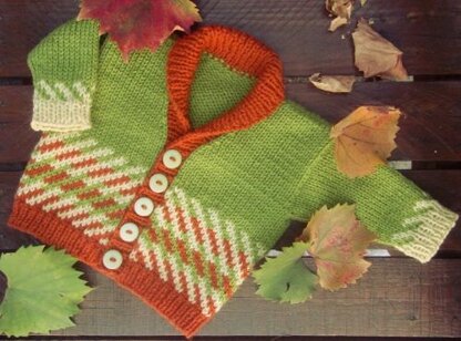 The Chevronette is knitted bottom-up. Although a three colour design, the diagonal pattern uses only two colours at a time. There are 5 sizes: 3 months to 3 years.