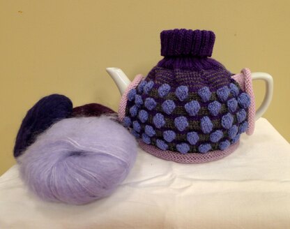 This tea cosy is knitted on a set of 4 double pointed knitting Needles in much the same manner as a sock. Starting at the top down, increases are worked to cater for the shape of the tea cosy and then the knitting is split on to straight needles to work the sides. Rows of bobbles and stripes of grey and purple yarn almost give this the effect of notes upon the music stave if you look closely. Lighter shades of mauve create the rolled openings for the spout , handle and bottom edge. Don’t be afraid to try this cosy it is not nearly as difficult as it looks and is great fun to knit. If purple is not your colour, simply change the colour scheme.