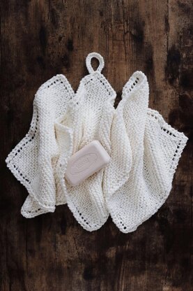 "Featuring soft, squishy garter knitted on the bias and a dainty eyelet lace edge, The Country Washcloths are a fun and easy must-knit project for home."