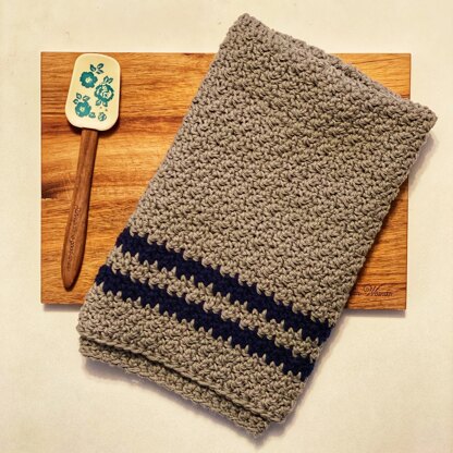 When my cousin bought her first house this fall, and I saw the adorable 100-year-old farmhouse that she was getting ready to remodel I knew I needed to make something for her soon to be kitchen. With that thought in mind I dug in a bit and found out what her color scheme was going to be & took a look at my cotton yarn collection and found this great darker grey and navy that I knew would be a great contrast in the room. Next up was determining the stitch to use so…I dug into my handy dandy stitch dictionary and found the Griddle Stich which not only works up a super dense fabric perfect for the kitchen but also gives the striping a bit of an uneven edge which I really love!