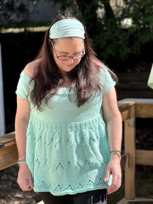 The top is constructed on the round from the top to Botton with a -2" of negative ease at bodice to have it as close to skin as possible since it will flare open on a baby doll style to more than double inches of ease. It has a lace design on the bottom part that makes the top flirty and playful. To make the top better fitted at the bust, Irt is recommended to handset an elastic thread to the ribbing at the empire waist.