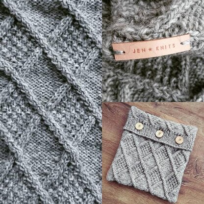 This is an envelope style cushion cover inspired by ganseys and vintage aran patterns. The diamonds represent the “drystane dykes” (dry stone walls) which divides fields all over the north east of Scotland.