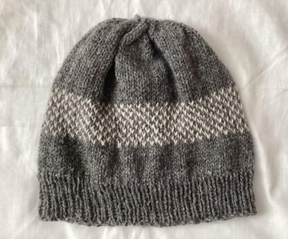 This hat is knitted from the bottom up on sizes UK 4 mm and UK 5 mm 16 inch circular needles using just two colours.
