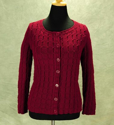 This cardigan has a classic, timeless silhouette with a simple cable stitch pattern. The cable stitches are unusual in that they are created with garter stitch in a field of stocking stitch. The stitch pattern is written in text and is memorized by any knitter quickly as the ten row repeat has only three different rows. The bands are integrated with the overall design and flow up with no obvious border at the bottom edge. The sleeve is a classic set in version. All sections are worked bottom up. Optional instructions have been included for waist shaping.