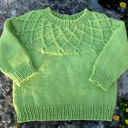 The Enigma is knitted top down. The yoke features lines of knit stitches that cross over and under each other while travelling across a panel of purl stitches.