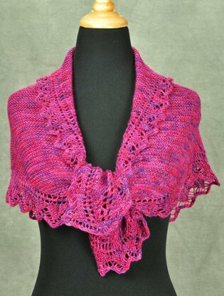 Evelyn Howard is a wide, shallow garter stitch based triangle scarf. It has lace edges that are knit at the same time as the body. The scarf is knit from corner to corner. What makes this scarf unusual is that the lace edging is on all three sides of the garter stitch triangle and the scarf is completely reversible. It is designed to be made with any amount of yarn in any gauge so it could easily be adapted to a larger shawl size. You can make this with any amount of yarn. Simply work the increase portion until you have used up half of your yarn and then move on to the decrease section.