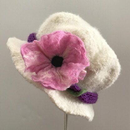 With your purchase you receive The Jilly Hat, two hat band patterns, and a crochet flower pattern shown in purple in the pics. You also receive comprehensive information on selecting appropriate yarn, felting, and the methods that I use to make felted hats. Embroidery stitches and wet felted pink and orange flowers patterns are NOT included.
