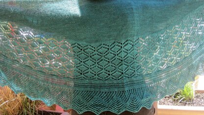 This long wingspan shawl features two distinct knitting patterns. The focal stitch is a true lace, and the edging is a famous one from the Shetland Islands. Together they make a beautiful shawl, which can be worn in many different ways. The very wide wingspan allows you to wear it in a variety of ways. The shawl measures 68 inches at the widest points across the top and is 28 inches deep at the deepest point. It is made with a heavier of the fingering weight yarns, and is knit on size 7 (U.S.) needles. The shawl requires approximately 1000 yards of yarn of any heavy-ish fingering weight yarn (6 - 6 1/2 sts/inch) making it both a perfect warm lacy shawl for the fall. The stitches are both charted and written out line by line. Skill Level: Intermediate (assuming a basic knowledge of lace knitting).