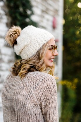 This pattern is written in Standard American Terms and rated Easy. The hat includes standard beanie instructions as well as a messy bun option.