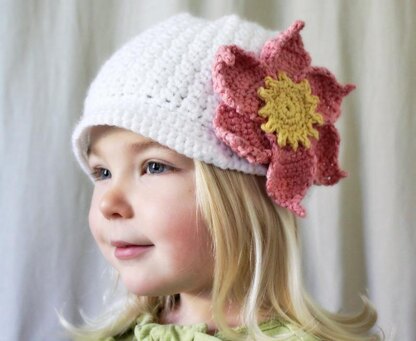 The Ginny Cap is an adorable fitted hat, featuring a textured stitch pattern and a cute, cloché style brim. The standout on this cap is the oversized magnolia flower that adorns the side. My daughter loves this cap!