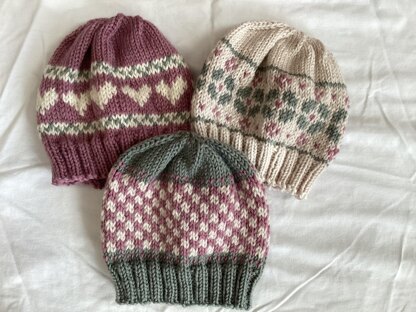 The hats are knitted from the bottom up on UK4 mm and UK 5 mm needles, using DK or Aran yarn.
