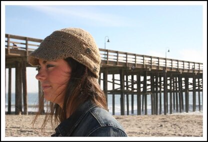 This stylish cap is made to grab and go. It is worked from the top down on two circular needles, with a sewn-in brim, and hem; and finished with two button tabs on the side.