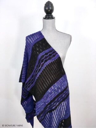 Contrasting garter stitch and lace segments create a mix of colours and textures in this project. It’s an entertaining knit which keeps you interested with the changes of stitch patterns and colours. The shawl is worked as a classic rectangle shape. Stitch patterns are in text only. The wrap is easy to wear and perfect for wrapping around your neck or tossed over one shoulder. You can use a pin and wear it like a poncho as an alternative look. The construction starts with a provisional cast on to allow for matching lace edges. Stitch patterns are worked in sequence, with alternating colours creating an asymmetrically patterned wrap. Links have been provided to blog tutorials for support. The pattern is listed as advanced, however the tutorials make this project accessible to intermediate knitters as well.