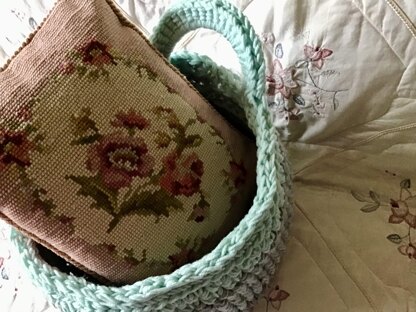 Sturdy and practical. Crocheted entirely in one piece with no seams. Fiber art at it's finest! Unique built in handle and a pedestal base. Simple crochet stitches throughout.