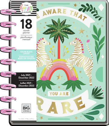 This Classic size Happy Planner features 18 dividers with different jungle themed graphics and animal prints with inspirational quotes. This planner comes in a colorblock layout and is dated from July 2021-December 2022. The colorblock layout is perfect for using as a timeline throughout your day or can be divided into work tasks, home responsibilities, and personal appointments with the blocked spaces.