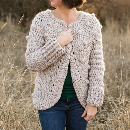 The Hartley women's crochet pattern features fun and feminine bobbles in a super bulky weight cardigan. Bold with a hint of romance, this sweater is both beautiful and quick to crochet. Designed with a circular yoke in FIVE sizes, you can try it on as you go to get the right fit.