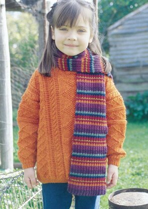 This collection of children's sweaters, scarves and dollies is worked in Jo Sharp Classic DK Wool. The sweater is a simple drop shoulder shape and is worked in knit & purl textures from a graph with some light cable work.