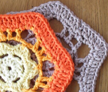 This motif is the third one in the series of 7 in The Hexagon Project 2013. The theme for The Hexagon Project 2013 is lacy simplicity. All 7 designs can be found in The Hexagon Project 2013. All hexagons are designed to be the same size so that they can be joined together and used to create a blanket or a cushion, table runner…..use your imagination! They are written for one continuous colour but can be done in many colours by changing colour at the start of each round. The motifs are suitable for those fairly new to crochet who can crochet in the round. The size of each motif is 20 cm (8 inches) from point to point in aran weight yarn. But please note that I do crochet fairly loosely.