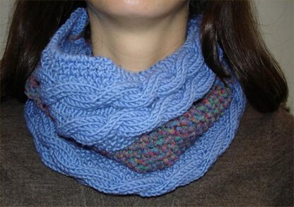 This season's hottest trend are the infinity scarves. This sample was knit with a solid worsted weight merino wool and a worsted weight multi colored yarn. These 2 different yarns are knit and attached to become one long circular scarf. It also looks great in 2 solids.