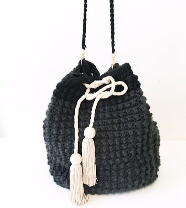 This is a pattern of beginner to intermediate difficulty. You will need a 5mm hook, 2 skeins of worseted weight yarn, 2 snap hooks for the strap, and optional decorative drawstring (I used a nice tasseled curtain tie back that I picked up at my local dollar store.)