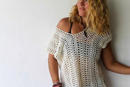 This is a crochet pattern for the Kahe Kai Top, a light and airy beach cover up which can double as a summer top. It is made up of simple double crochet, treble crochet and puff stitches which adds to the overall unique boho beauty of this design.