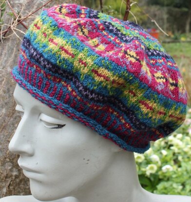 This is a classical beret that comes in two widths, one that fits snuggly and the other that is floppier. It is completed in the round. The brim is completed in a two colour rib and the remaining pattern is done in Fair Isle using the six colours. Each ball of yarn is only 25g and you will need 6 balls for the pattern. Kits are also avaiable.