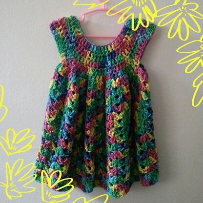 Simple to follow top down dress with yoke style increases and a cluster stitch pattern to the main body. Can be made longer or shorter as desired and is worked almost entirely in treble crochet stitches. Easy to understand and quick to make.