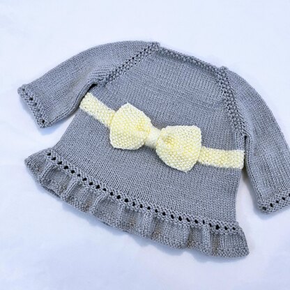 This is a lovely sweater for a baby girl with a lemon ribbon on the chest. Initially, the sweater is knitted flat (back and forth) and later it is joined in the round. The sweater is worked top down with raglan sleeves and no seam required. Part of the back is open for easy dressing. I sewed on a flat button and made a chain using a crochet hook to fasten it. These can easily be replaced with satin ribbon if desired. The bottom has cute ruffles that make it super girly.