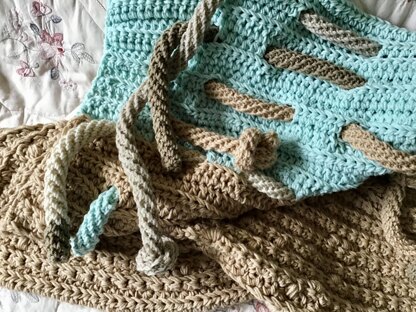 Cords weave in and out of The Lighthouse Throw with bold knots throughout. So unique a design. Fits any decor in any room. Simple crochet stitches used. Completely reversible. CARON BRAND ONE POUND YARN USED IN THIS PATTERN.