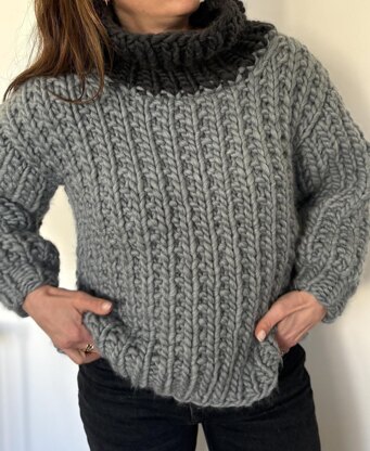 Oh baby it's cold outside. This sweater is the perfect weight for those freezing winter days. It is also great to wear in the Fall or Spring on a cool evening. It is super soft with the stitch texture of this stitch pattern and a great quick knit! The neck is super slouchy when worn up but you can also fold it over as a turtleneck. The contrasting color for the neck is a fun touch but this pullover looks just as nice knit solid.