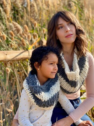 This pattern is available as a kit with Lion Brand! The kit comes with all the yarn needed to make 1 adult and 1 child size cowl. You can even customize your yarn color! A PDF digital download of the pattern is included in the kit.