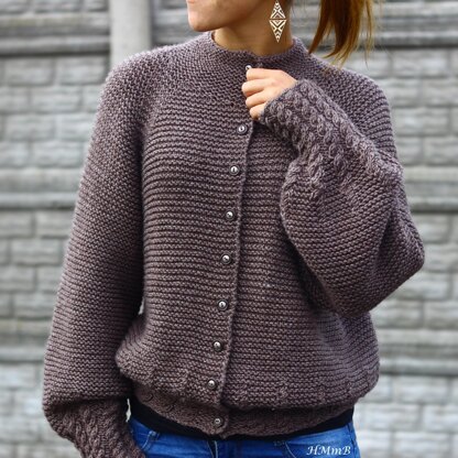 If you can increase, short row shaping and cable stitch you can knit this. This is a raglan style cardigan knit flat on circular needles from the top down. The sleeves are added once the cardigan sweater body is complete, no seaming required.