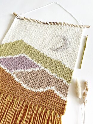 The Mini Moon Ridge Wall Hanging would make the perfect gift for the outdoorsy girl in your life who loves modern and trendy wall decor. This wall hanging would also be the perfect piece in your fall market inventory. This pattern is for intermediate crocheters who are comfortable working with more than one color.
