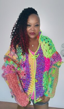 The cardi is made up of simple and easy crochet stitches & is an easily customizable piece to suit your body size. The sleeves are made to be baggy, dramatic, & oversized with long & exaggerated cuffs for extra flair. The cardi is 20ins in length, but can be shortened or lengthened depending on your personal preference.