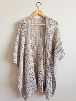 A lightweight flowy ruana/cover up made of dk yarn that creates a breathable material. Constructed from side to side with minimal seaming, this pattern is perfect for advanced beginners.